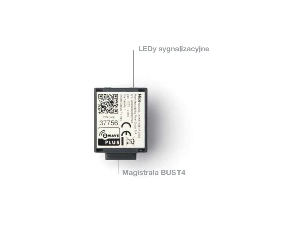 IBT4ZWAVE lze namontovat na automatizační zařízení Nice s konektorem sběrnice BUST4 a integrovat a spravovat je prostřednictvím libovolné ústředny Z-Wave (není součástí dodávky!)