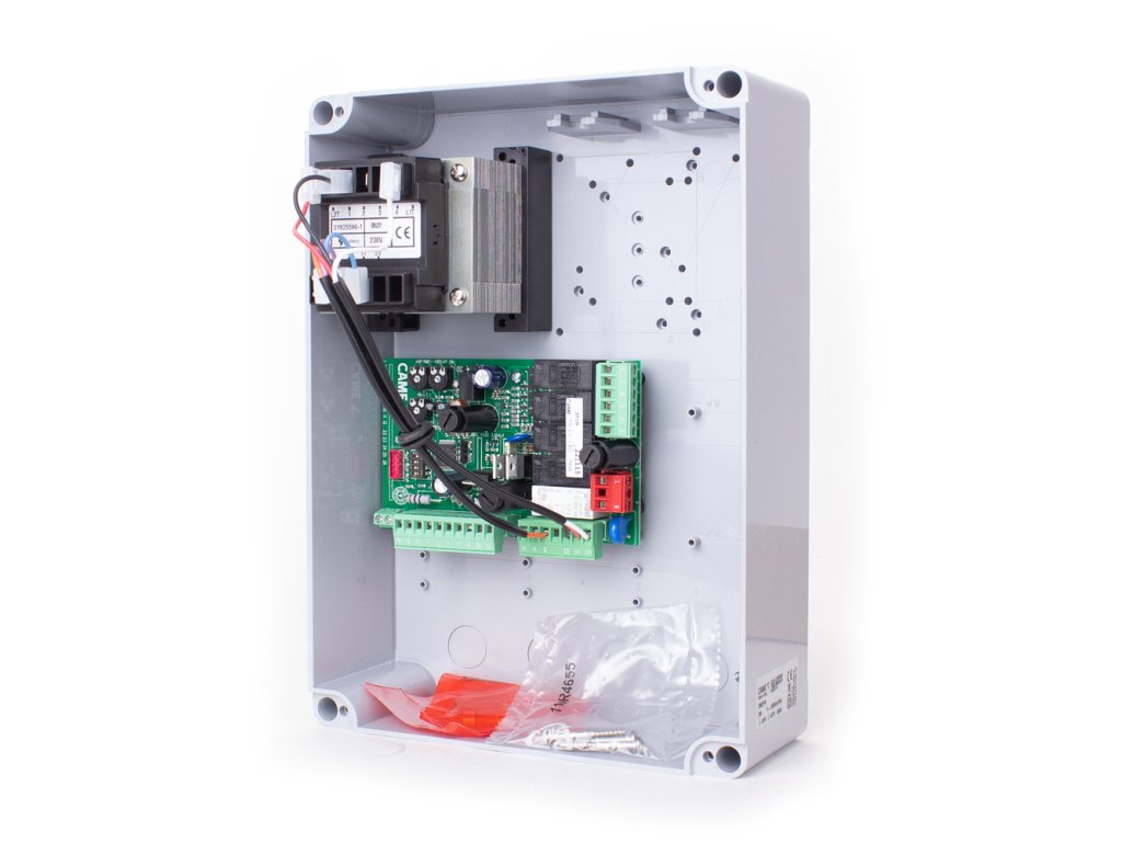Řídicí jednotka pro dvoukřídlé brány s vestavěným dvoukanálovým rádiovým dekodérem. Má funkci zastavení, vstup pro jednu fotobuňku a výstup pro elektrický úderník. Kryt z ABS, rozměry D 204 x V 274 x H 133 mm.
