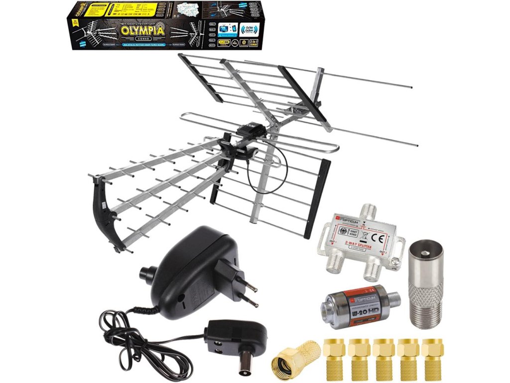 - Složení sady: směrová anténa DVB-T 1000+ LTE OLYMPIA COMBO Red Eagle (BX-1000), nastavitelný anténní podavač, anténní zesilovač 20 dB, DVB-T SAT rozbočovač pro 2 TV, 6 x F-zástrčka Big Nut, 1 x F-zásuvka / TV zástrčka Spacetronik
