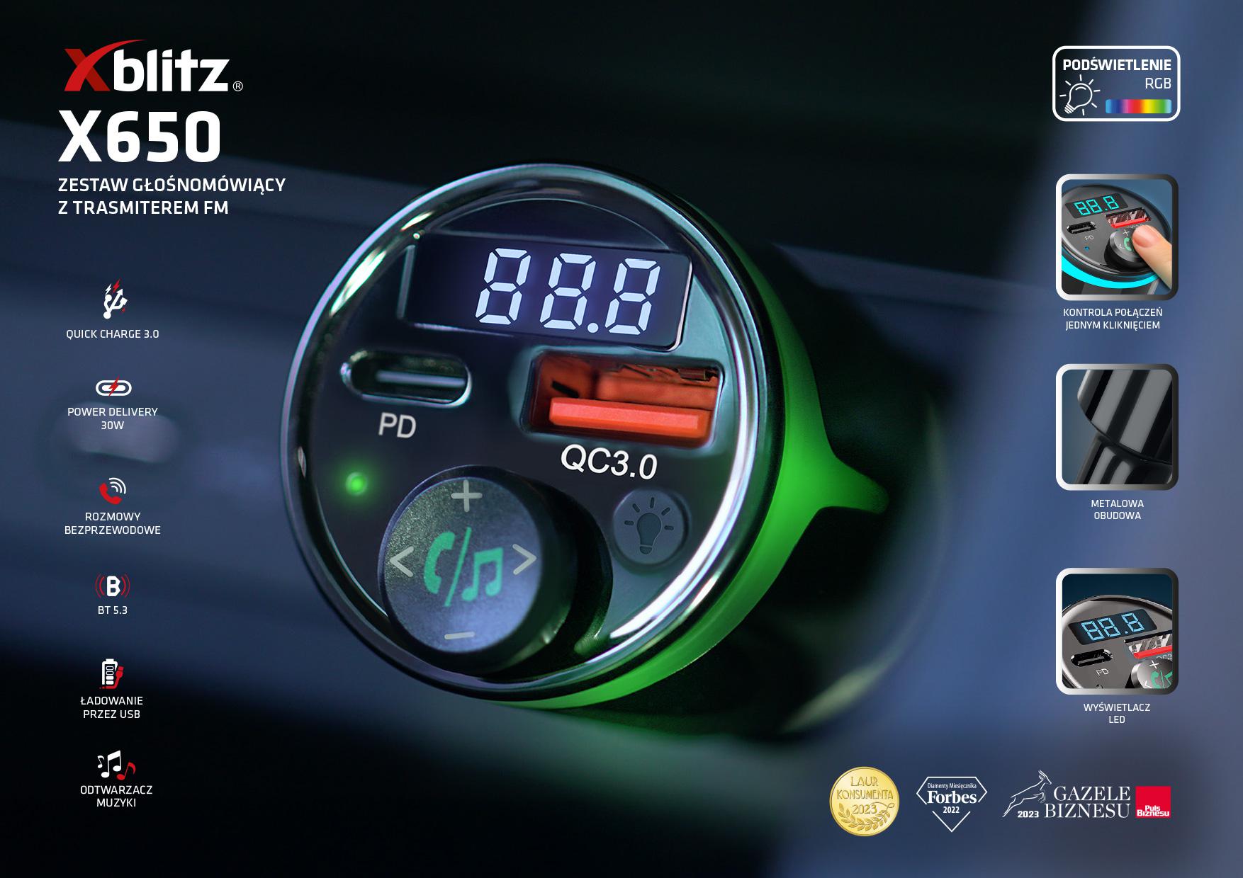 Zařízení funguje jako špičková hands-free sada pro vaše pohodlí a bezpečnost za volantem. Vestavěný mikrofon a ovládání pomocí pohodlného multifunkčního joysticku vám umožní přijímat hovory pouhým pohybem zápěstí, aniž byste museli sahat po telefonu. Kromě toho Xblitz X650 promění váš vůz v mobilní koncertní síň a umožní vám bezdrátově přehrávat hudbu přímo z telefonu do reproduktorů vozu.