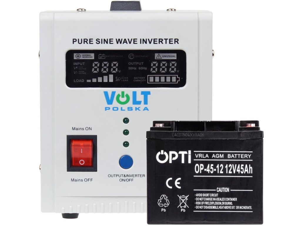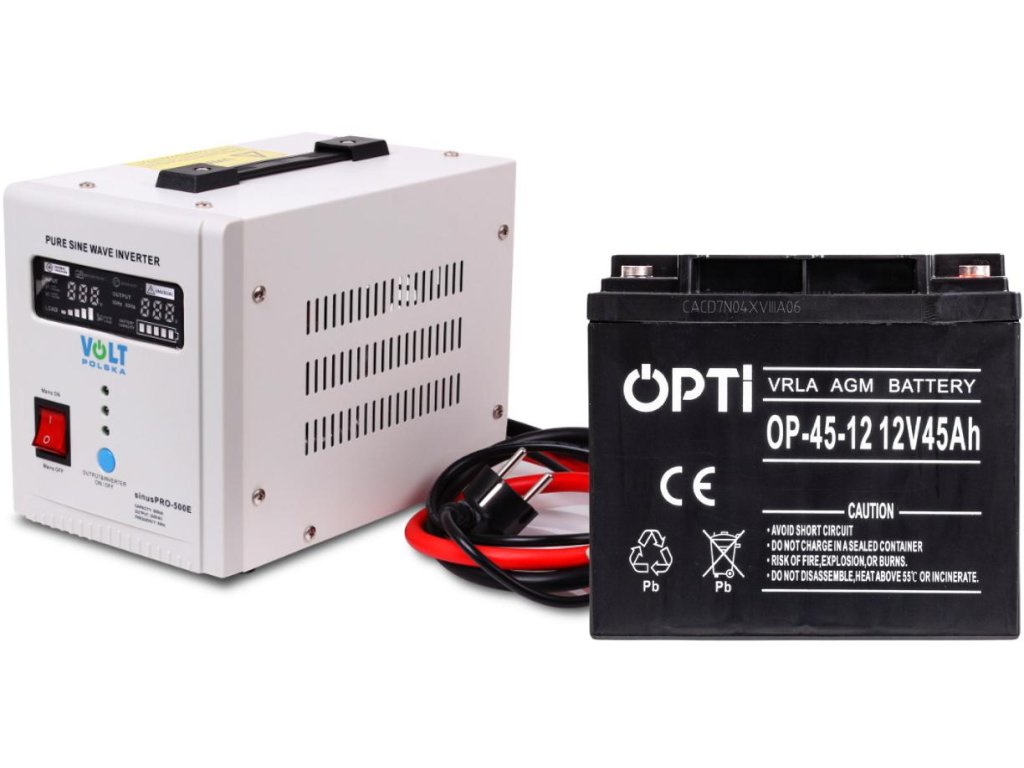 Sada nouzového napájení 45Ah 500W , který se skládá z baterie VOLT POLAND 12V 45Ah z řady OPTI a 12V měnič 300/500W je to kompletní nouzová napájecí souprava!