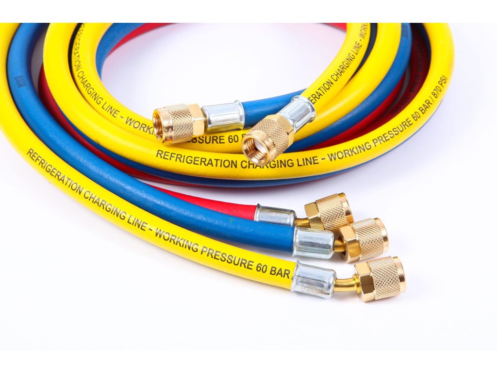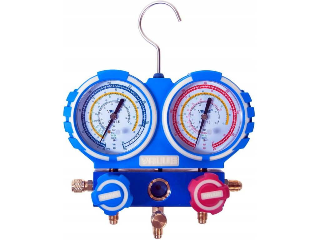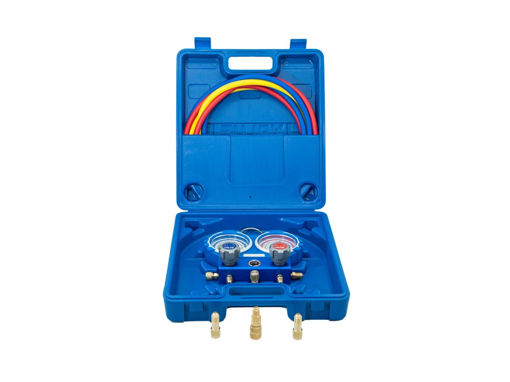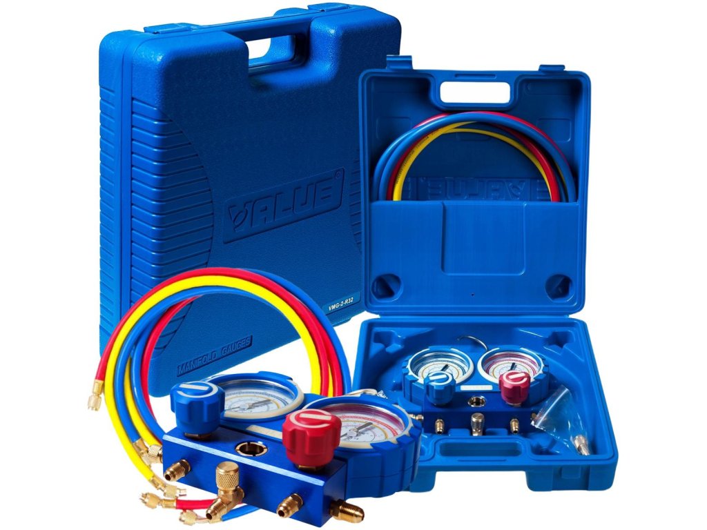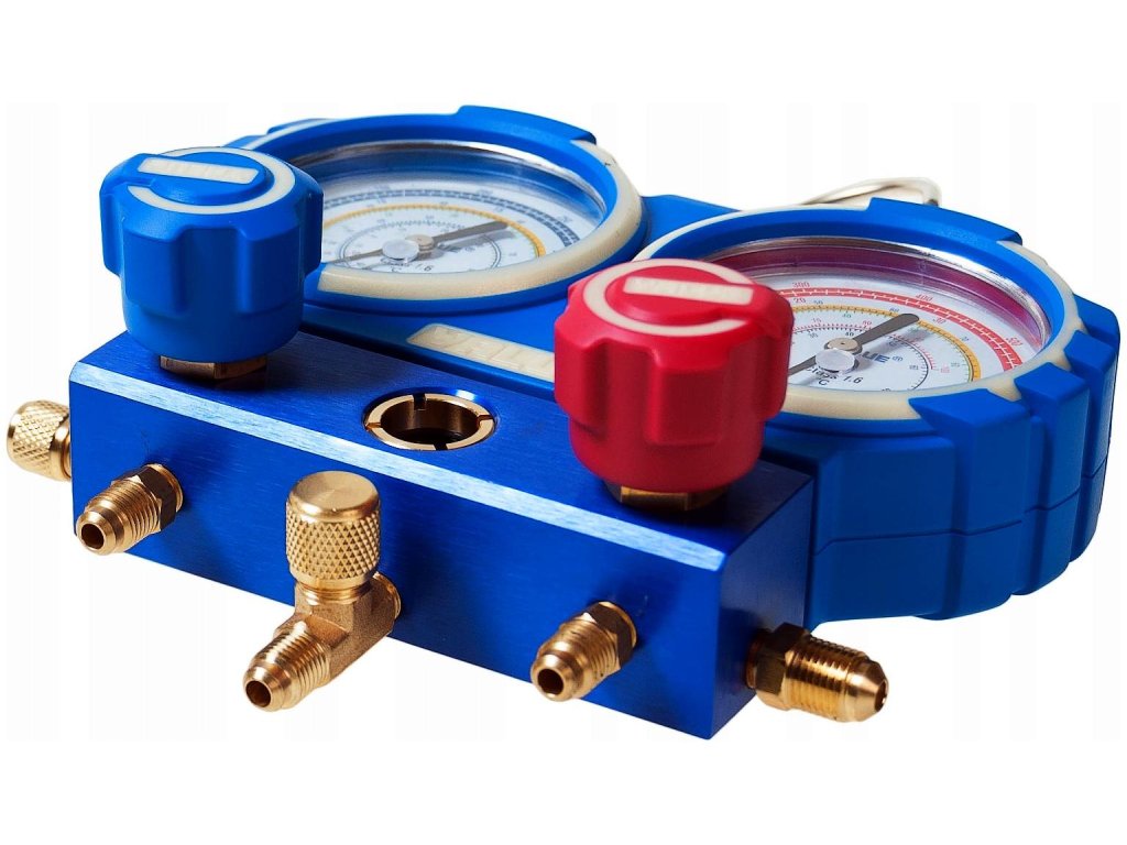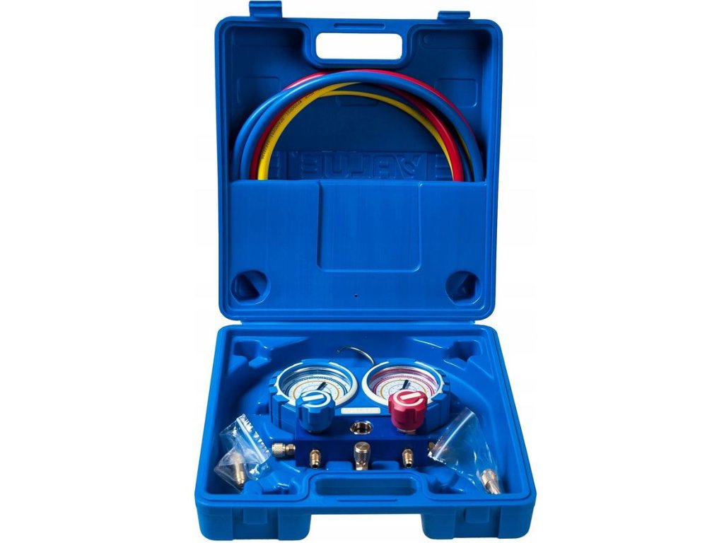 Sada manometrů určená pro chladicí a klimatizační systémy.