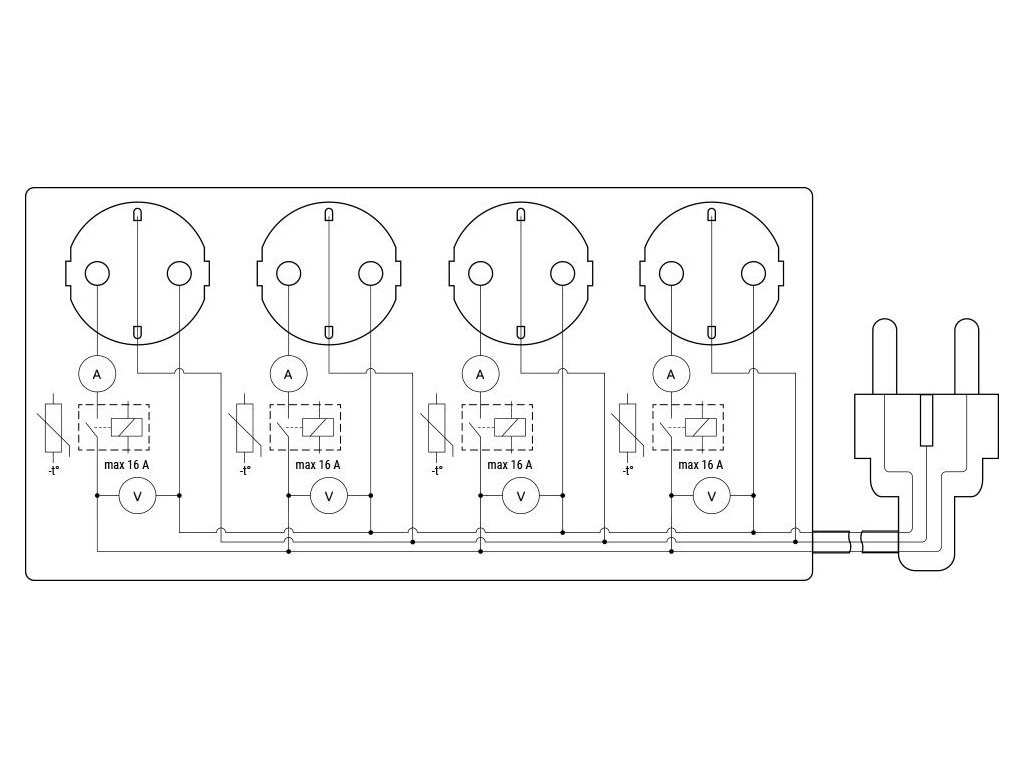 - Maximální zatížení: 16 A (celkem pro všechny zásuvky), 12 A na jednotlivou zásuvku, max. 3680 W.