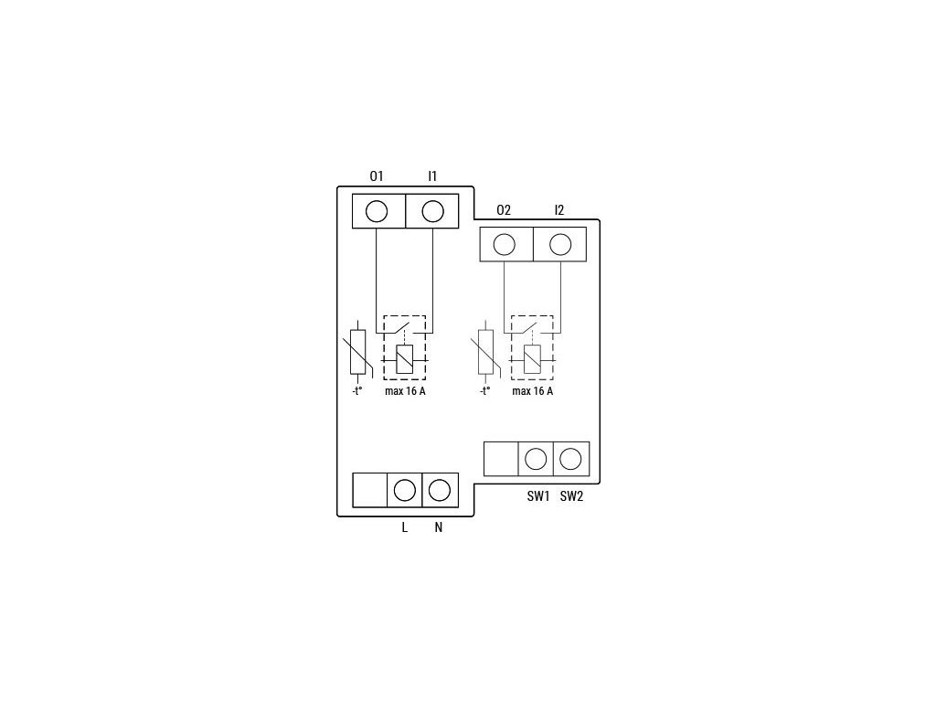 - Vstupy: 2 × tlačítko/spínač (SW1/SW2), 2 × napájecí vstup (N, L), I1/I2