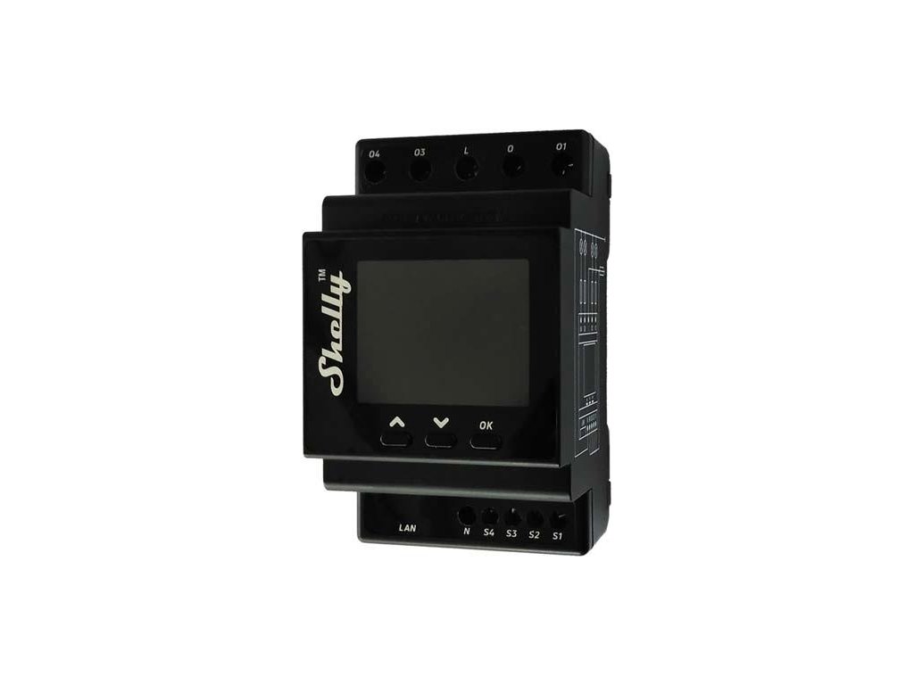 Shelly Pro 4PM - profesionální čtyřkanálové relé DIN s měřením energie, LAN/Wi-Fi, grafickým displejem pro domácí, kancelářskou a průmyslovou automatizaci