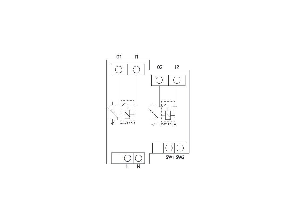 - Vstupy: 2 × přepínač/tlačítko (SW1, SW2), 2 × napájecí vstup (N, L), 2 × reléový vstup (I1, I2)