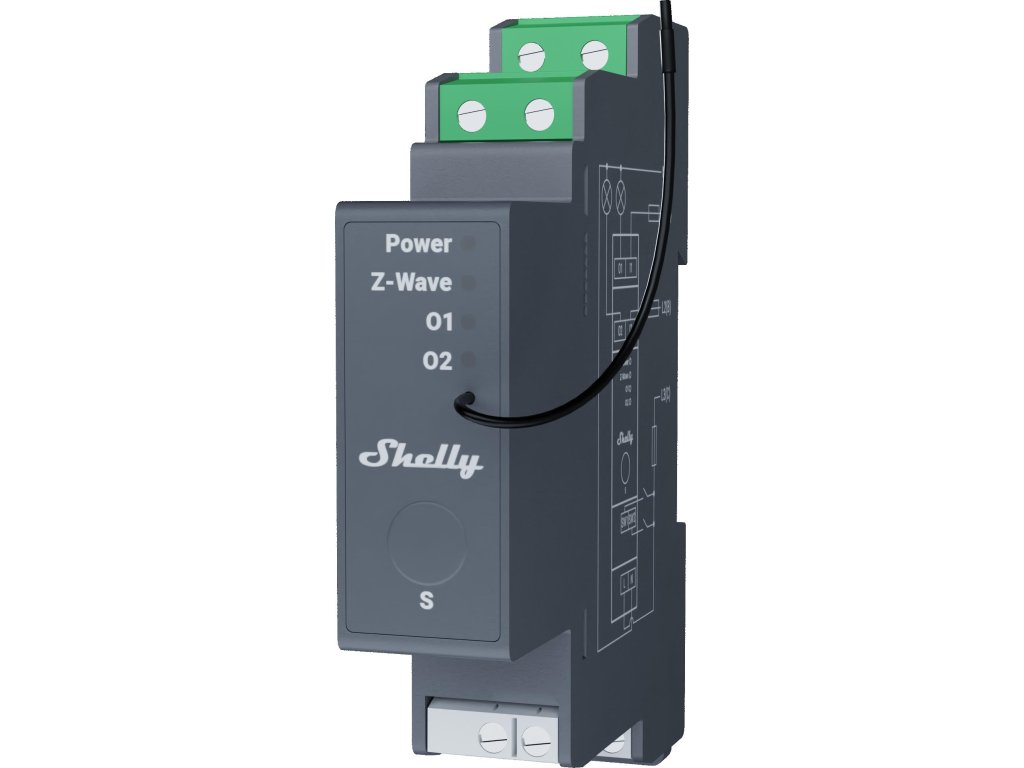 Shelly Wave Pro 2 US LR - Dvoukanálové Z-Wave Mesh/relé s dlouhým dosahem DIN (až 12,5 A/kanál, 25 A celkem), bezpotenciálové kontakty, SmartStart