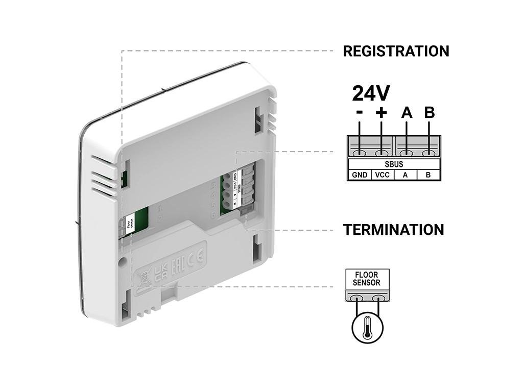 Registrace- Klíč na zadní straně jednotky slouží k registraci řídicí jednotky v systému. Jeho stisknutím se zahájí proces párování s ústřednou. Po správném dokončení registrace se na obrazovce řídicí jednotky zobrazí odpovídající zpráva.
