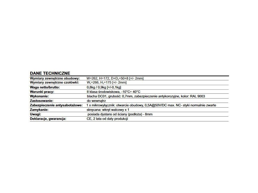 Skříň EXPANDER 2 Použití: SATEL, DSC, PARADOX, RISCO Rozměry: Š=260 V=170 D=50 mm Ochrana proti sabotáži: sabotáž - otevření skříně Poznámky: povrchová montáž skříně, zavírání - šroubované x1, vzdálenost od stěny 8mm Ochrana proti sabotáži:Doplňkové parametry