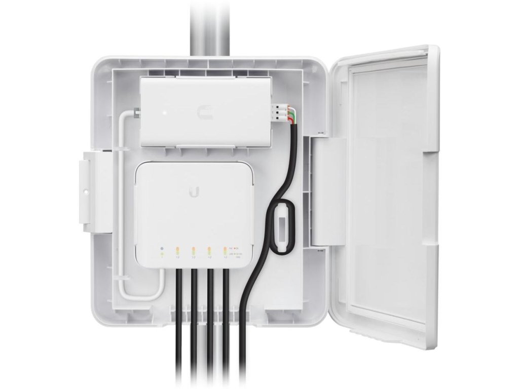 USW-Flex-Utility je venkovní kryt odolný proti povětrnostním vlivům určený pro použití s UniFi Switch Flex.