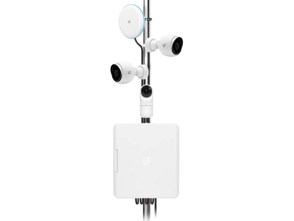 Kufřík obsahuje připojovací kabel Ethernet a adaptér PoE 60 W poskytuje maximální rozpočet PoE 46 W. USW-Flex-Utility lze snadno namontovat na sloup. Příslušenství zaručuje bezproblémové vedení kabelů a je vybaveno šroubovým zámkem pro zajištění.