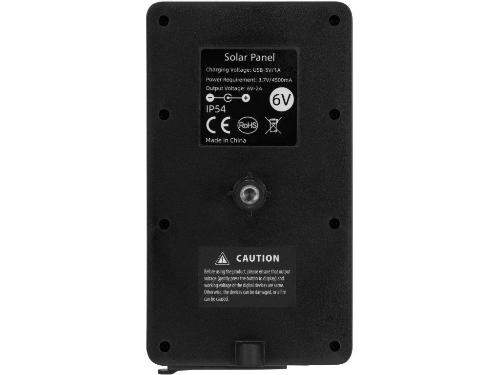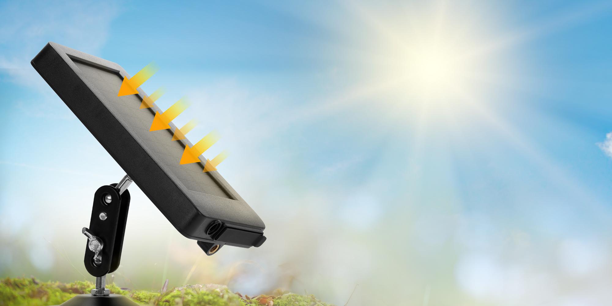 Po připojení fotopast nejprve využije energii uloženou v lithium-iontové baterii solárního panelu. Když úroveň jejího nabití klesne pod minimum, zařízení se automaticky přepne na napájení z baterií AA nebo akumulátorů NiMH. Díky tomu můžete využívat delší dobu bezúdržbového provozu, což je důležité zejména při dlouhodobém sledování těžko přístupných míst.