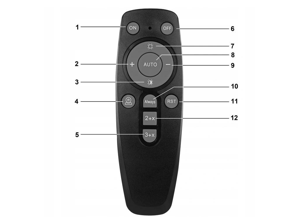 - Režim AUTO : je základní provozní režim svítidla. Indikuje režim ovládání senzoru přiblížení po celou noc. Svítilna svítí stále přibližně na 10 % výkonu a při detekci pohybu na 100 % výkonu.