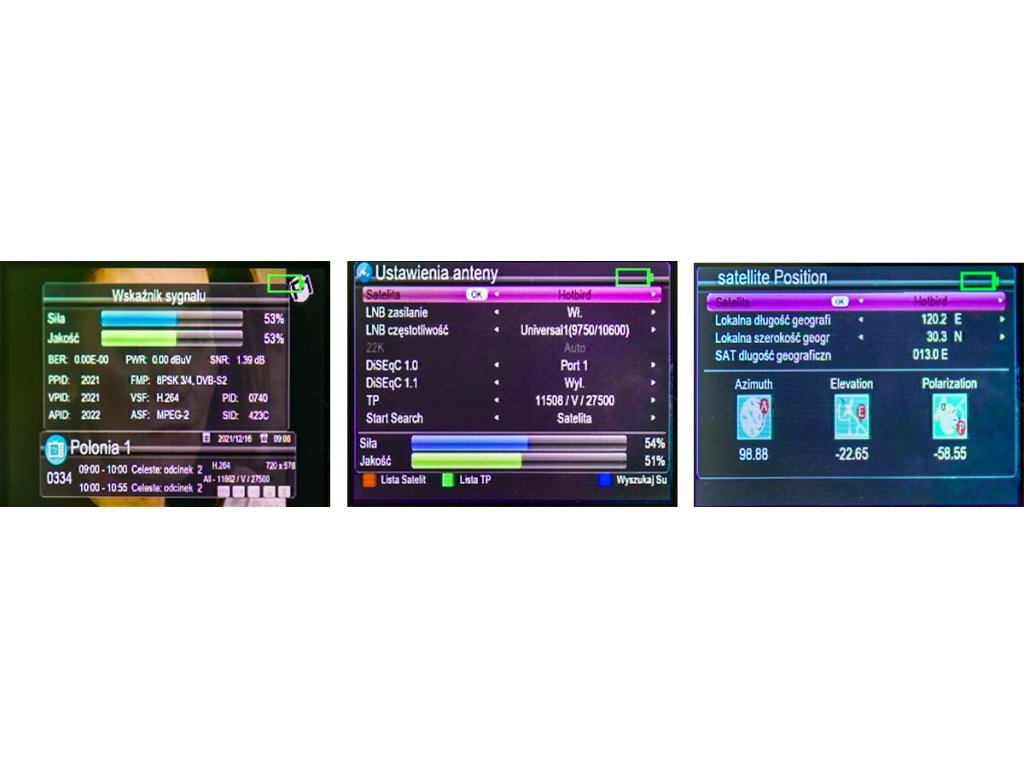 - Vyhledávání satelitního signálu po výběru satelitu a frekvence v %, PWR dBuV, dB, BER.