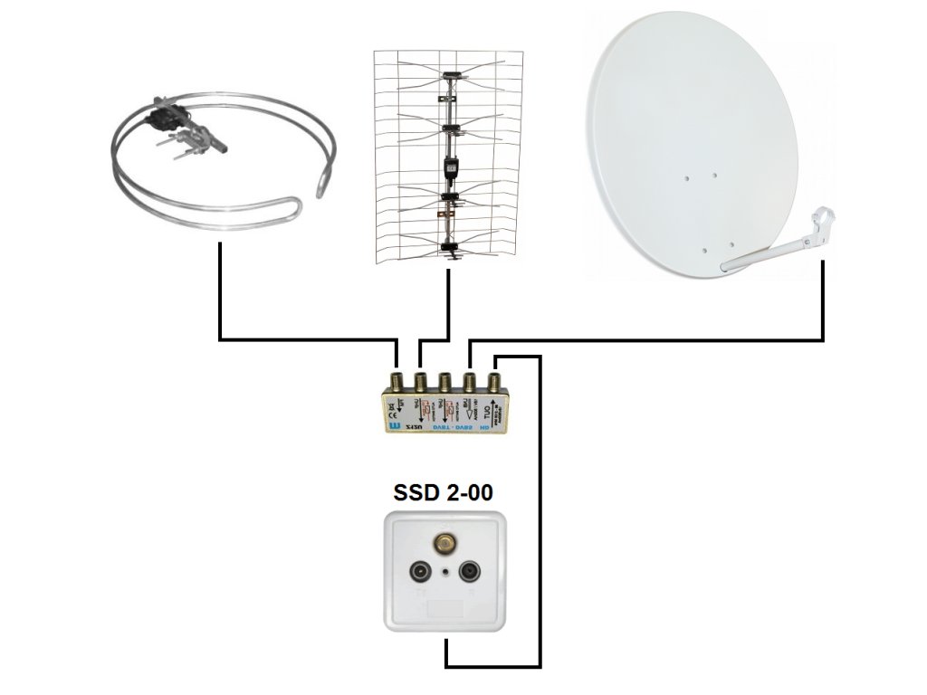 Širokopásmová účastnická zásuvka s filtrem oddělujícím pozemní televizní, satelitní a rozhlasový signál. Díky snadné demontáži krabice je zásuvka univerzální a umožňuje povrchovou i zapuštěnou montáž. Zásuvka má jeden vstup pro anténní kabel a tři výstupy signálu - pro satelitní TV, digitální pozemní vysílání DVB-T a rozhlasový signál. Níže je uveden příklad aplikačního schématu.