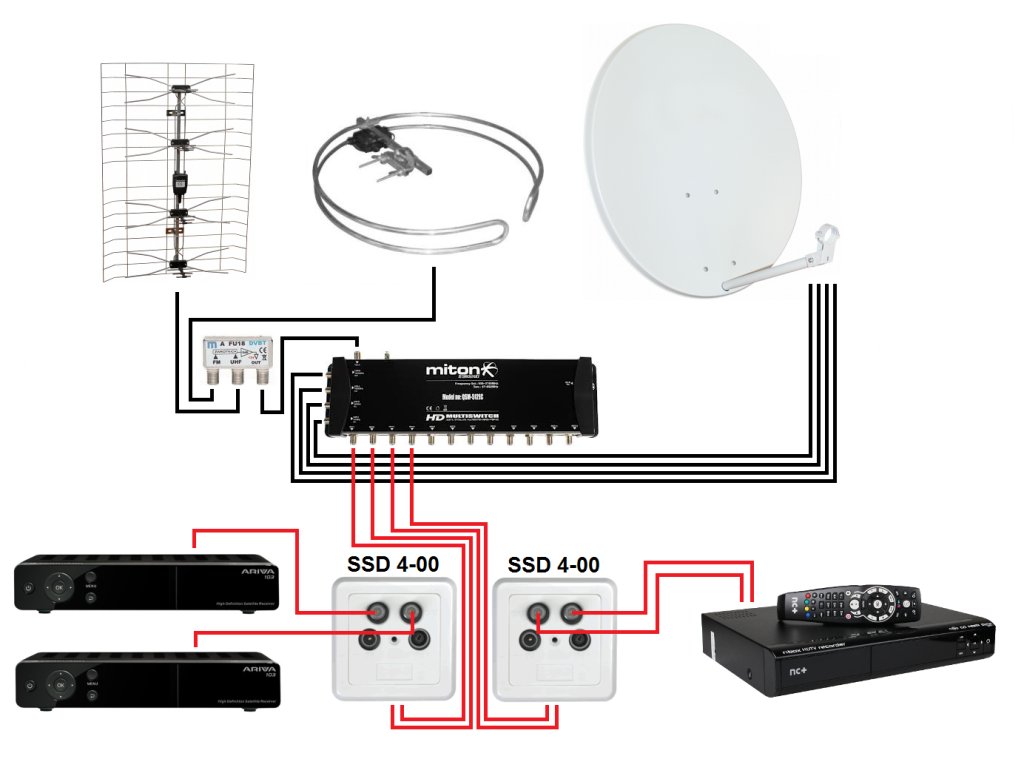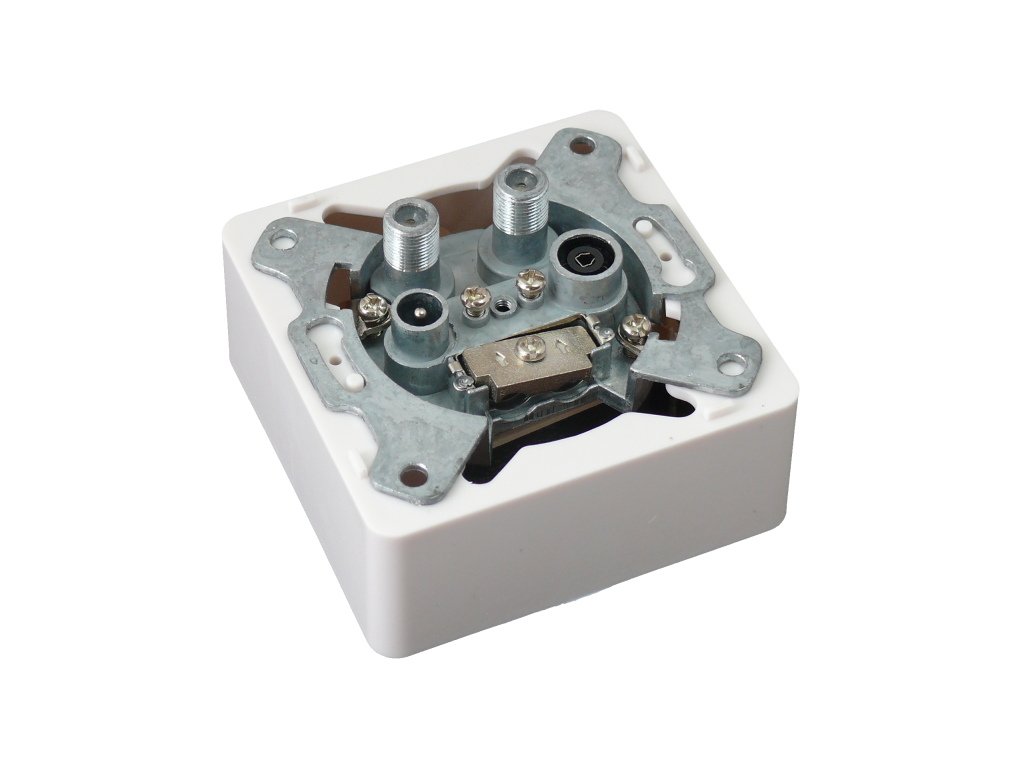 Širokopásmová účastnická zásuvka s filtrem oddělujícím pozemní televizní, satelitní a rozhlasový signál. Díky snadné demontáži krabice je zásuvka univerzální a umožňuje povrchovou i zapuštěnou montáž. Zásuvka má jeden vstup pro anténní kabel a čtyři výstupy signálu - dva pro satelitní televizi, jeden pro digitální pozemní vysílání DVB-T a jeden pro rozhlasový signál. To umožňuje připojit dva nezávislé satelitní dekodéry s jedním tunerem nebo jeden dvojitý tuner (s rekordérem). Níže je uveden příklad aplikačního schématu.