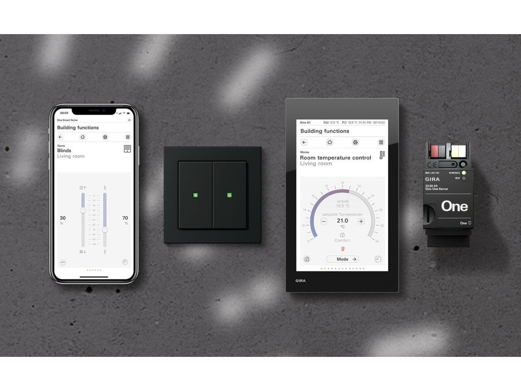 Funkce systému Gira One Smart Home lze ovládat běžným způsobem pomocí přepínačů. Tlačítka jsou k dispozici ve verzi, která odpovídá všem programům ve stylu Gira System 55 a Gira F100. Kromě toho je možné ovládání prostřednictvím aplikace Gira Smart Home, přes trvale instalovaný ovládací panel Gira G1 nebo mobilně pomocí chytrého telefonu nebo tabletu.