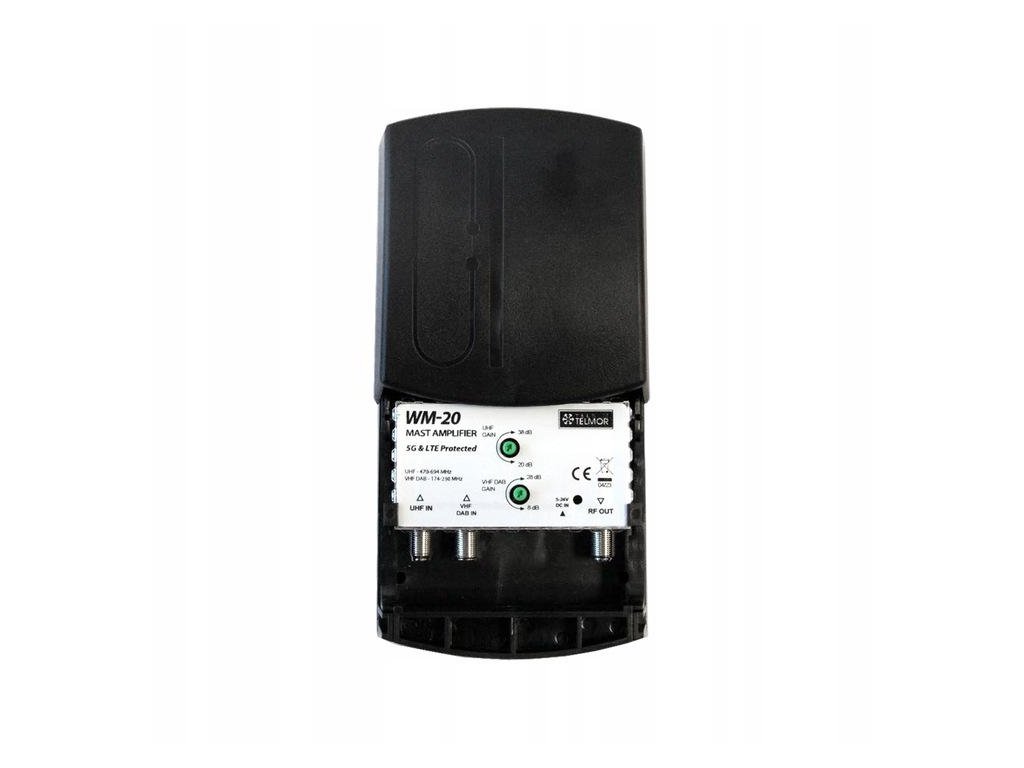 WM - 20 - dva vstupy, první pro UHF pásmo 470-694MHz, zisk 20..38dB, druhý pro VHF/DAB pásmo 174-240MHz, zisk 8..28dB.