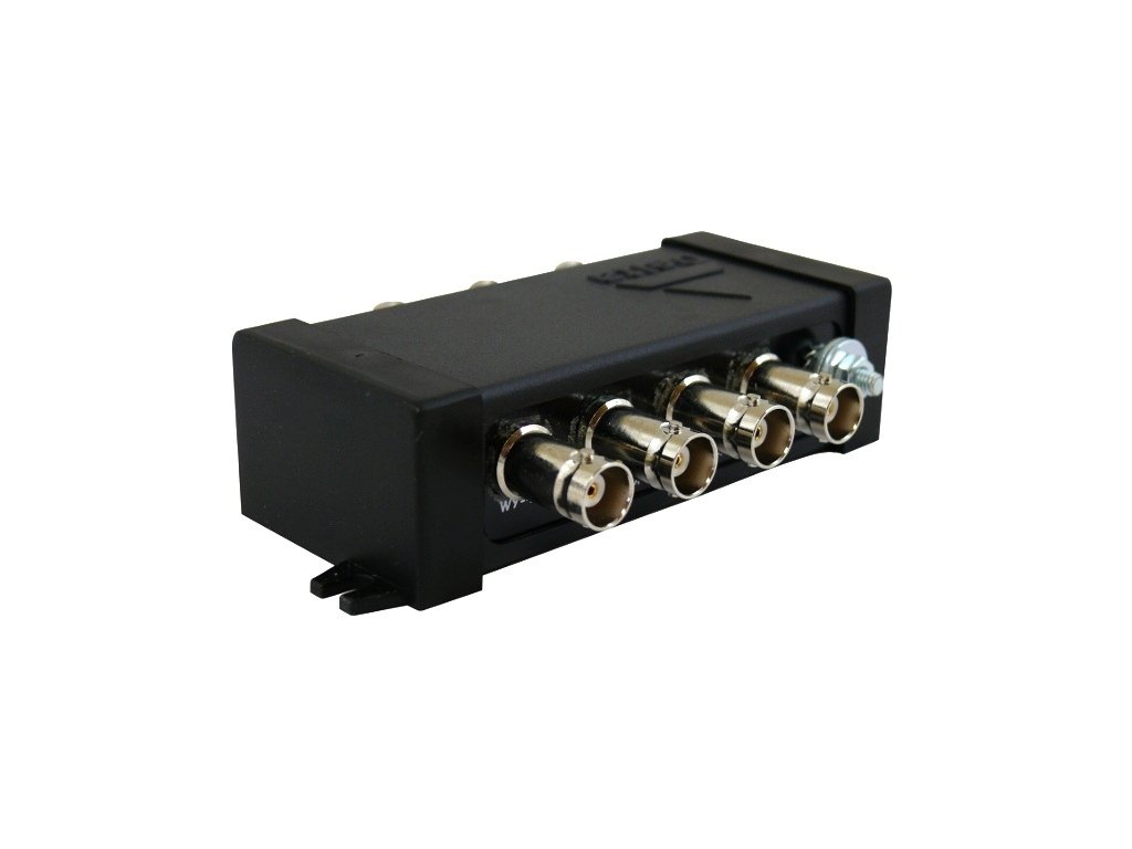 OPV-4 není symetrický a chráněné zařízení by mělo být připojeno k výstupním zásuvkám BNC (WY-1 až WY-4). Zásuvky BNC LINE by měly být připojeny k přenosovému vedení, na kterém se může vyskytnout přepětí. Práce na připojení by se neměly provádět během bouřky. OPV-4 by měl být připojen k dobrému uzemňovacímu systému. Svodič přepětí by měl být umístěn co nejblíže chráněnému zařízení. Připojení OPV-4 podle níže uvedeného schématu umožňuje chránit monitory nebo jiná zařízení (např. DVR).