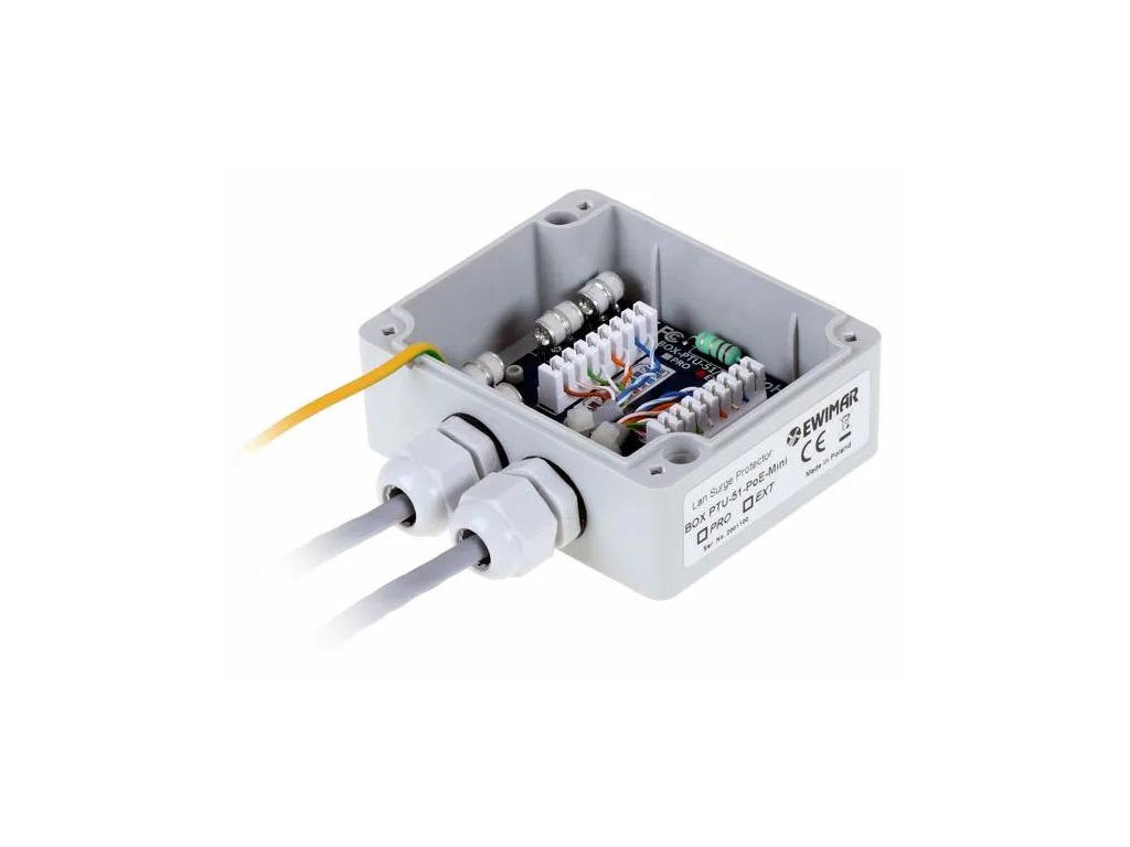 BOX-PTU-51-EXT/PoE/MINI je určen k ochraně směrovačů, přepínačů LAN, IP kamer, přístupových bodů WiFi a dalších zařízení pracujících ve 100Mbitových sítích. Má účinnost ochrany 4-5kA @ 8/20μs jednotlivě pro každý vodič kabelu (v závislosti na jejich tloušťce). Chrání koncová zařízení LAN instalovaná na stožárech nebo kovových konstrukcích, před účinky blesku, přepětí, sabotážních akcí a rozdílu potenciálů. Účinně eliminuje indukované přepětí při výbojích uvnitř přenosových párů a mezi napájecími páry PoE. Uzemňovací vodič odvádí napětí a přepěťové proudy z přeskoků jisker do země. Vestavěná pojistka MOSFET zvyšuje ochrannou účinnost a snižuje ekvipotenciální proudy mezi uzemňovacími body instalace CCTV.