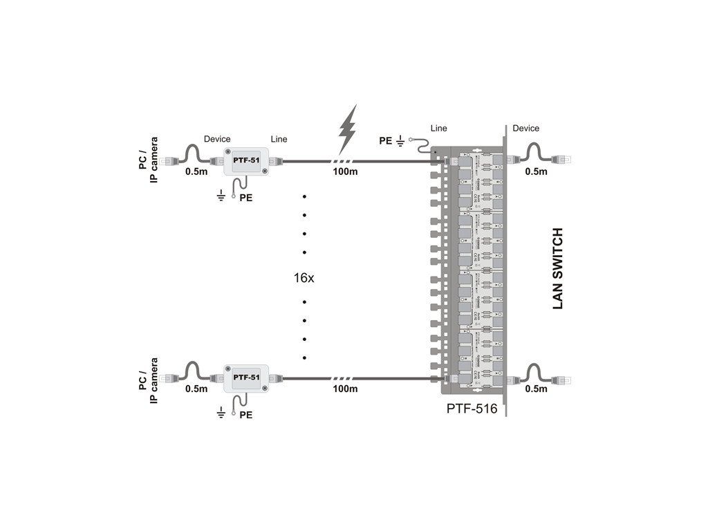 PTF-51-EXT/PoE/T zajišťuje spojitost stínění kabelů FTP mezi vstupem a výstupem a navíc odvádí do země náboj, který vzniká mezi stíněním a zemí. Protože se doporučuje uzemnit stínění kabelu FTP pouze na jedné straně, je stínění na straně chrániče při běžném provozu galvanicky odděleno při 90 V DC.