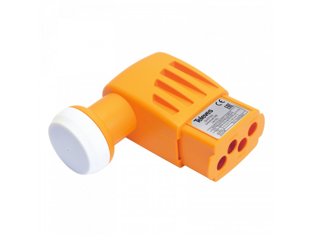 LNB konvertor Quattro se 4 výstupy, přičemž každému výstupu je přiřazena pevná kombinace polarity a pásma (Hh, Hl, Vh, Vl). Každý výstup je označen danou barvou: černá - Vl, červená - Vh, žlutá - Hh a zelená - Hl.