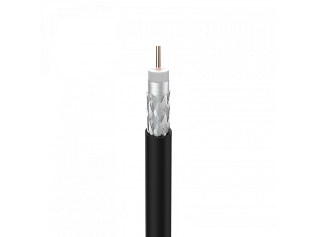 Koaxiální kabel RG-6 s měděným vodičem a hliníkovým opletením (Cu/Al). Vynikající pokrytí opletením (77 %). Kabel 16PAtC, dvojité stínění, vnější plášť: PE.