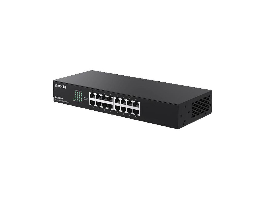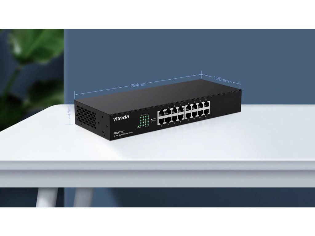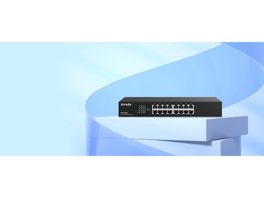 Switch Tenda TEG1016D je 16portový switch s podporou gigabitového ethernetového připojení. Každý ze 16 portů zařízení má funkci automatického křížení MDI/MDIX, což umožňuje rychlou instalaci bez nutnosti kontrolovat typ použitých kabelů. Zařízení navíc splňuje standard 802.3az (EEE), známý také pod pracovním názvem Energy-Efficient Ethernet, který definuje nižší spotřebu energie a provoz bez ventilátoru. Přepínač je postaven na špičkovém čipu Broadcom StrataConnect-series. Speciální spolehlivá konstrukce zajišťuje, že napájení a porty jsou chráněny proti indukčnímu blesku až do 6KV. Gigabitové rychlosti a přepínací kapacita až 32 Gb/s poskytnou efektivní základnu i pro ty nejnáročnější aplikace. Zařízení umožňuje rychlý přenos velkých souborů a grafiky po síti a streamování pro aplikace, jako jsou multimédia, VoIP, videokonference a online hry, bez jakéhokoli rušení nebo zpoždění.