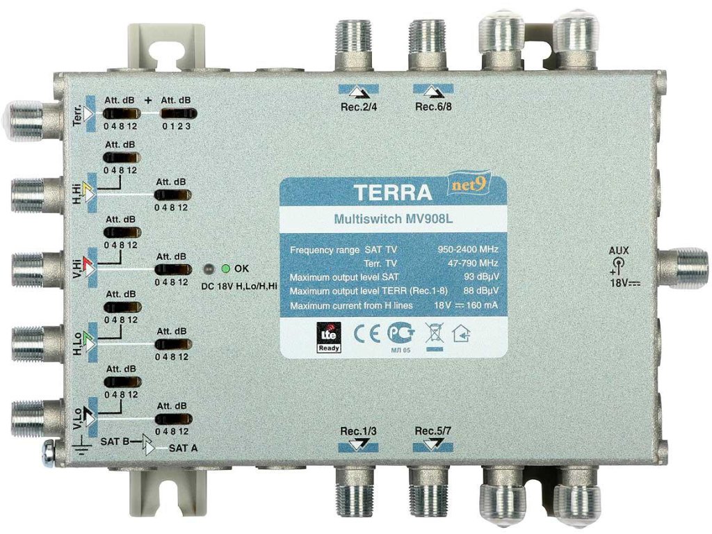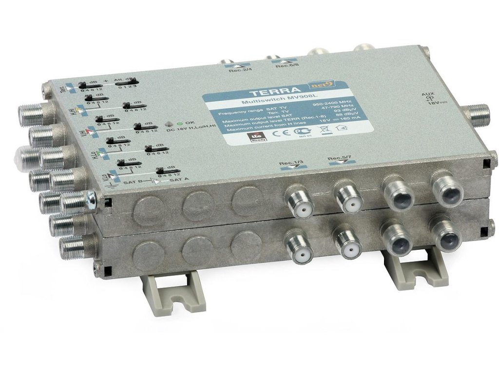 Multipřepínač MV-908L R70858 má aktivní (zesílené) pozemní a satelitní televizní kanály. Nastavení úrovně signálu pro každou ze satelitních cest a cest DVB-T se provádí pomocí vyhrazených přepínačů. Tato konfigurace zajišťuje větší stabilitu nastavených parametrů ve srovnání s tradičními řešeními založenými na potenciometrech.