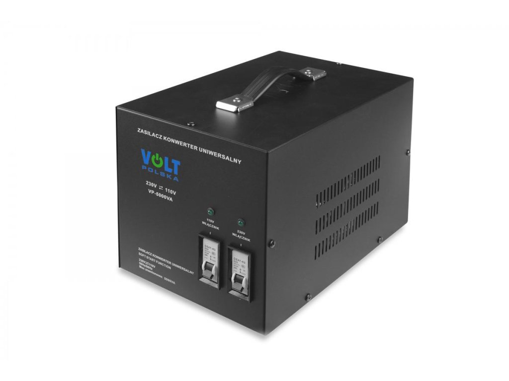 Univerzální měnič napětí VP 5000 230/110V se používá ke snížení napětí AC-230V na AC-110V nebo ke zvýšení napětí AC-110V na AC-230V. Mimořádně užitečné, pokud chcete napájet zařízení pocházející z USA, Japonska.