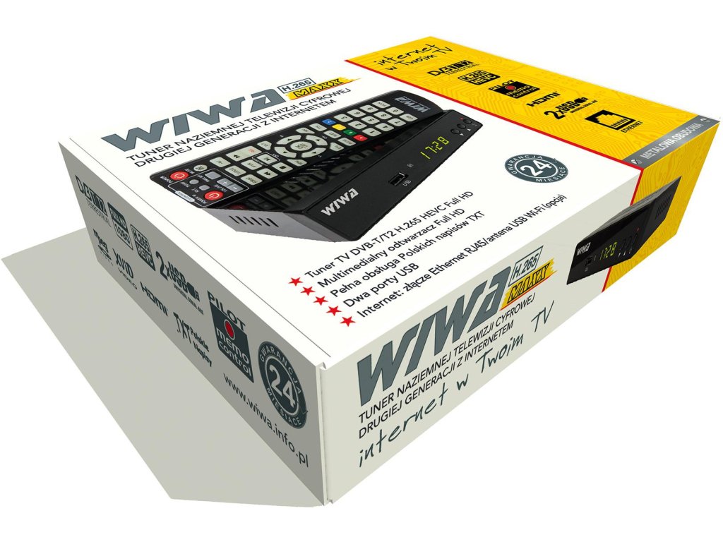 Moderní tuner (dekodér) DVB - T/T2 WIWA H.265 MAXX podporuje volně vysílané kanály pozemní digitální televize v nejnovější technologii H.265/HEVC. Jedná se o normu, která bude platit v Polsku. Tuner je kompatibilní se staršími technologiemi H.264 a MPEG-4, což jsou současné vysílací standardy v Polsku, což zvyšuje úroveň použitelnosti dekodéru DVB - T/T2 WIWA H.265 MAXX a zároveň zaručuje provoz ve standardu H.265/HEVC.