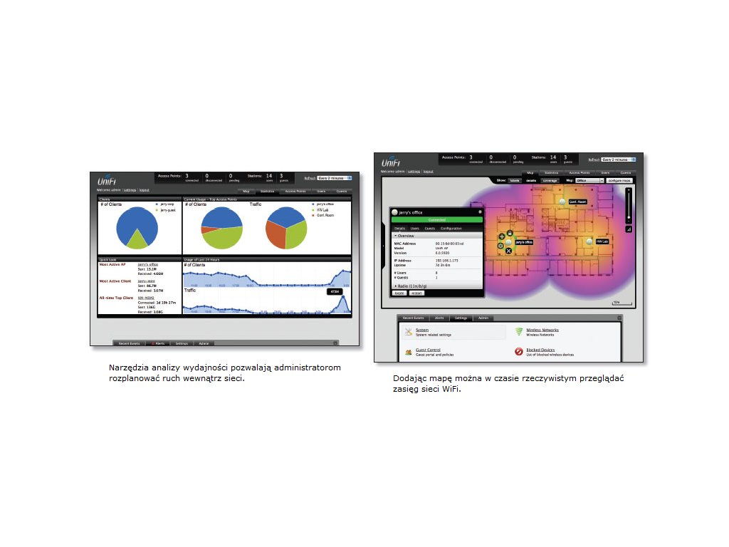 Charakteristickým rysem produktu je doplňkový software UNIFI WiFi Enterprise System, který umožňuje konfigurovat a spravovat síť zařízení UniFi z počítače prostřednictvím webového prohlížeče. Kromě toho umožňuje zobrazovat stavy zařízení v reálném čase, automaticky detekovat nová zařízení a zahrnovat mapy místností a zobrazovat dosah signálu každého zařízení.