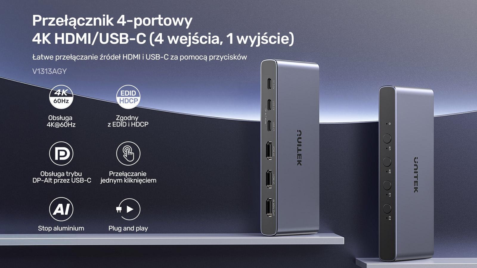 UNITEK V1313AGY - přepínač 4 v 1 HDMI/USB-C s podporou 4K@60Hz