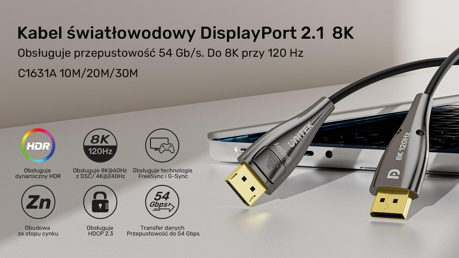 Optický kabel Unitek DisplayPort 2.1 8K@120Hz pro profesionální a herní aplikace