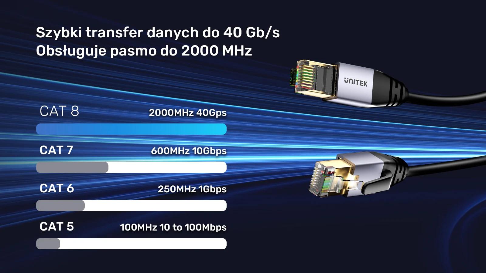 S kabelem Unitek Cat 8 máte jistotu přenosu dat rychlostí až 40 Gb/s s šířkou pásma až 2000 MHz pro plynulý přenos dat bez jakéhokoli rušení. Jedná se o ideální řešení, pokud chcete mít bleskurychlý přístup k internetu - zejména při hraní online her nebo sledování filmů v nejvyšší kvalitě. Zapomeňte na přerušení a zpoždění!