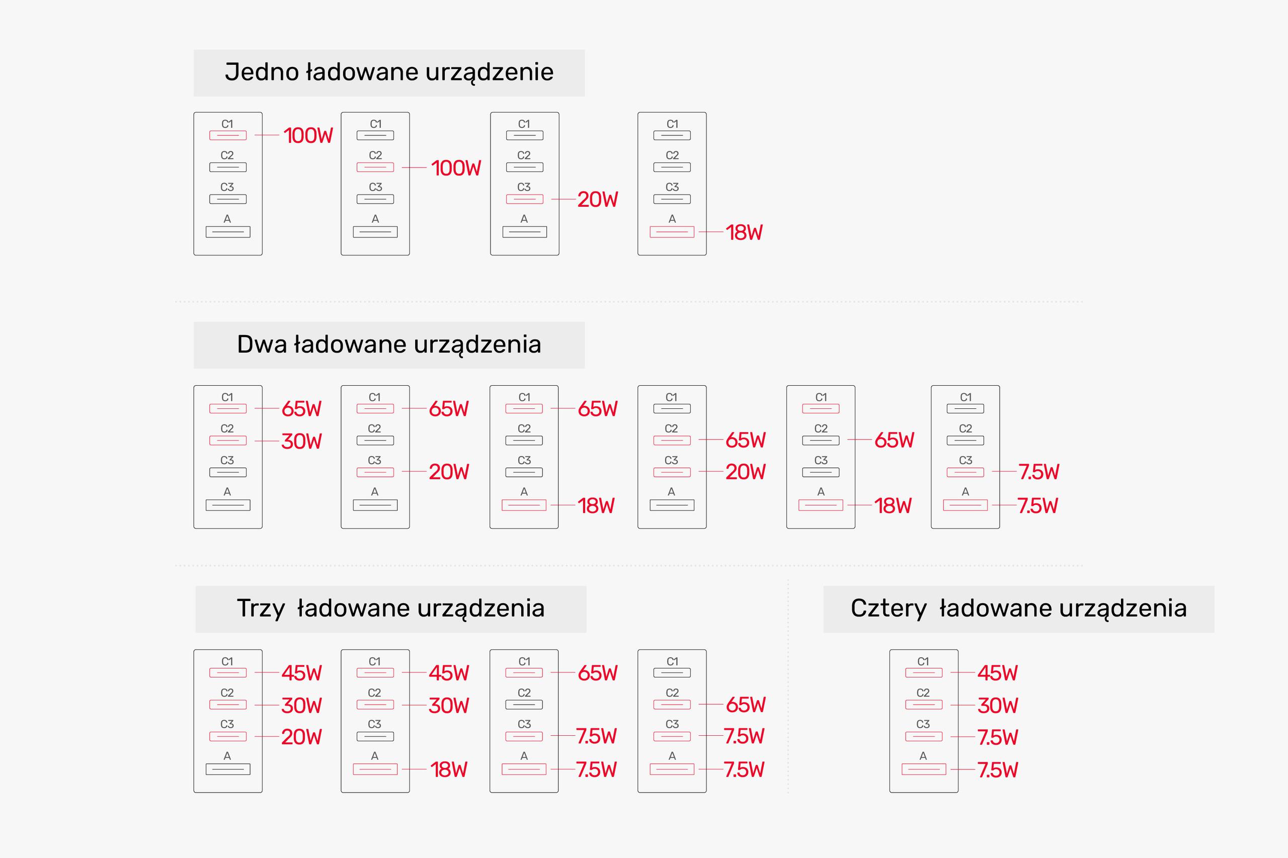GaN umožňuje současné nabíjení na všech čtyřech portech. Porty USB-C 1. a 2. podporují až 100 W, zatímco třetí port podporuje až 20 W. Port USB-A podporuje rychlé nabíjení Quick Charge 3.0 až do 18 W a je zpětně kompatibilní. Při připojení zařízení ke všem třem portům USB-C je maximální výkon na prvním portu 45 W, na druhém portu 30 W a na třetím portu 20 W. Nabíjení přes jeden port USB-C a jeden port USB-A poskytuje maximální výkon 65 W na prvním a 18 W na druhém portu. Při nabíjení čtyř zařízení najednou nabízí první port USB typu C maximálně 45 W, druhý port USB-C 30 W a třetí porty USB-C a USB-A po 7,5 W. Celkový výstupní výkon nabíječky je 100 W, dosažitelný při nabíjení jednoho zařízení z portů USB-C 1 nebo USB-C 2.
