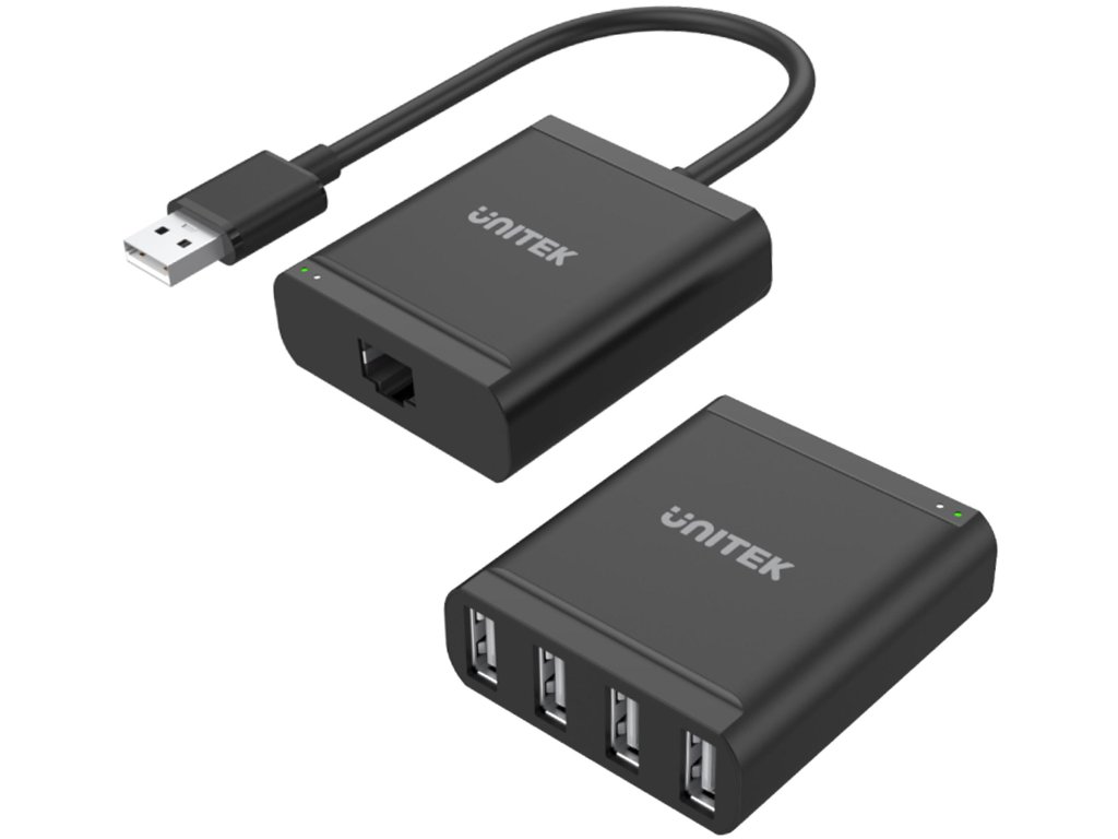 Rozšiřovač USB po kroucené dvojlince, který podporuje všechna oblíbená zařízení USB: tiskárny, kamery, čtečky čárových kódů, skenery, klávesnice, myši nebo dotykové obrazovky. Připojit lze maximálně 4 různá zařízení USB. Maximální délka přímého připojení je 60 m. Připojení se provádí standardním kabelem UTP kategorie 5/5e/6. Extender podporuje připojení USB ve standardu USB 2.0, tj. poskytuje přenos až 480 Mb/s.napájecí zdroj je součástí sady. Napájecí přípojka bude nutná kvůli možnosti provozu až 4 zařízení. Extender funguje Plug&Play a ke své činnosti nepotřebuje žádné ovladače. LED diody umístěné vedle portů informují uživatele o stavu připojení.