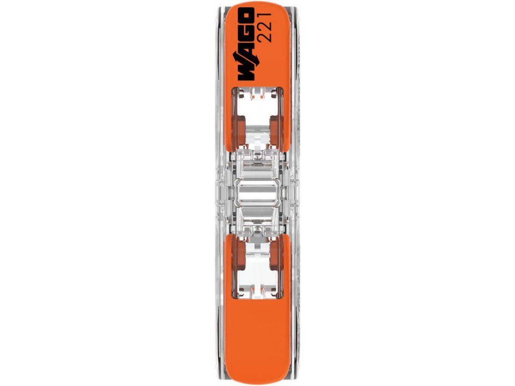 Instalační konektor WAGO s pákami řady 221 pro vodiče různých průřezů se vyznačuje inovativní konstrukcí. Tento konektor se stal výrazným poznávacím znamením mezi spojovacími komponenty. Ploché páky v zavřeném stavu prakticky směřují ke krytu, celý konektor má téměř oblý tvar a lze jej umístit do jakéhokoli prostoru bez obav z vyčnívajících hran. Díky šikovnému tvaru každé páčky lze konektory 221 ovládat zcela bez použití nářadí, což zajišťuje pohodlnou instalaci kabelů. Průhledné pouzdro vyniká robustním zpracováním a umožňuje vizuální kontrolu, která potvrzuje správné nasazení vodičů. Páčky připomínající klávesy klavíru jsou dokonalou kombinací funkčnosti a estetiky spojovací technologie "Made by WAGO".