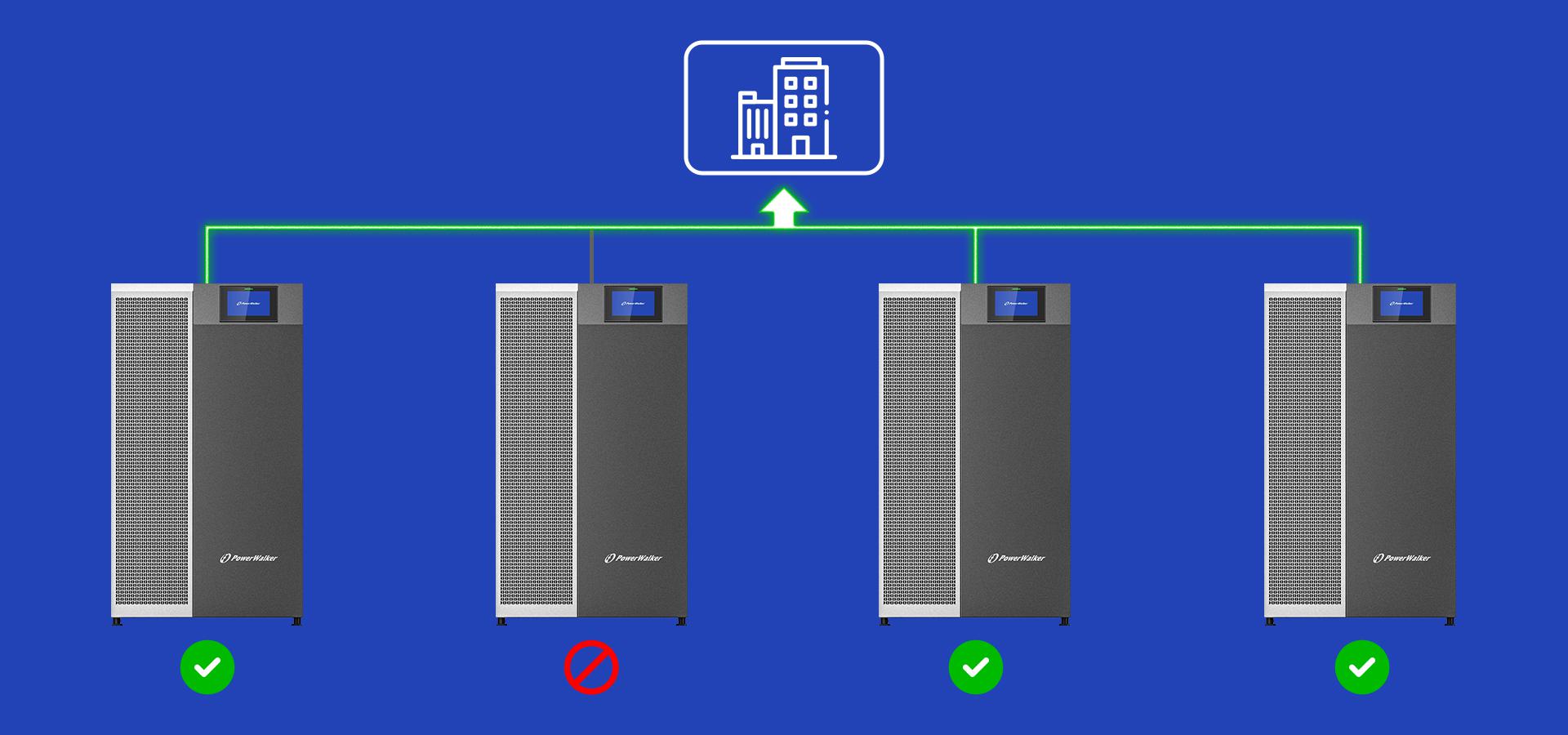 S tímto řešenímaž 4 jednotky této třífázové UPS mohou spolupracovat, šířitnapájení a zajištění nepřetržitého napájení i v případěnedostatek elektřiny v jedné z fází neboselhání jeden z modulů. Použití napájecích zdrojů s možností paralelního provozu poskytuje vynikající zabezpečení pro kritické situacevybavení ve výrobních podnicích a datových centrech -nouzové napájení zůstává vždy k dispozici.