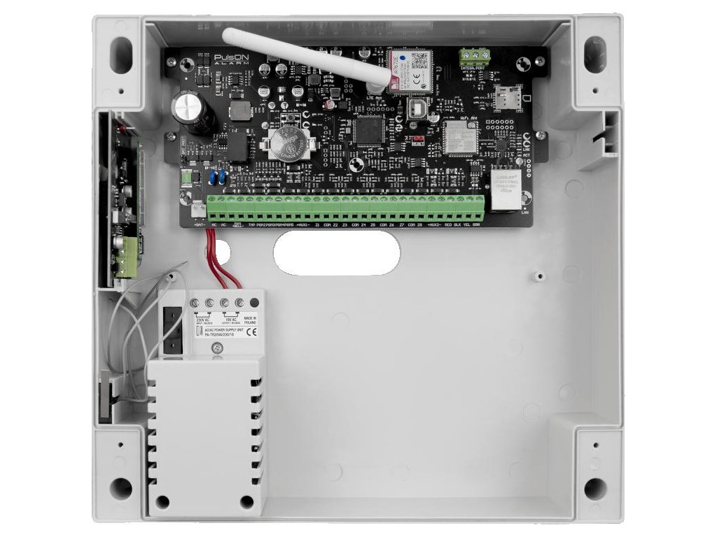 Ústředna PulsON Alarm 2.0 4G je srdcem nejnovějšího hybridního zabezpečovacího systému. Na desce ústředny je 8 linkových vstupů detektorů s možností rozšíření počtu vstupů na maximálně 80 pomocí expandérů.