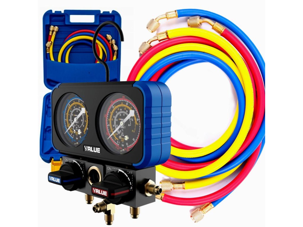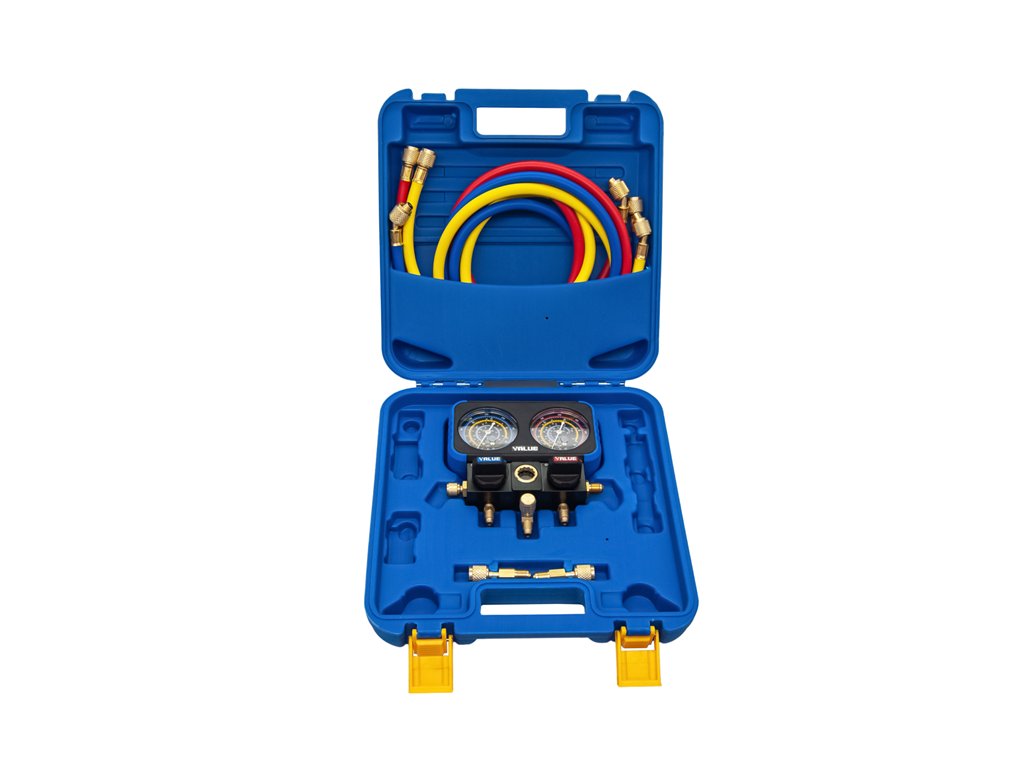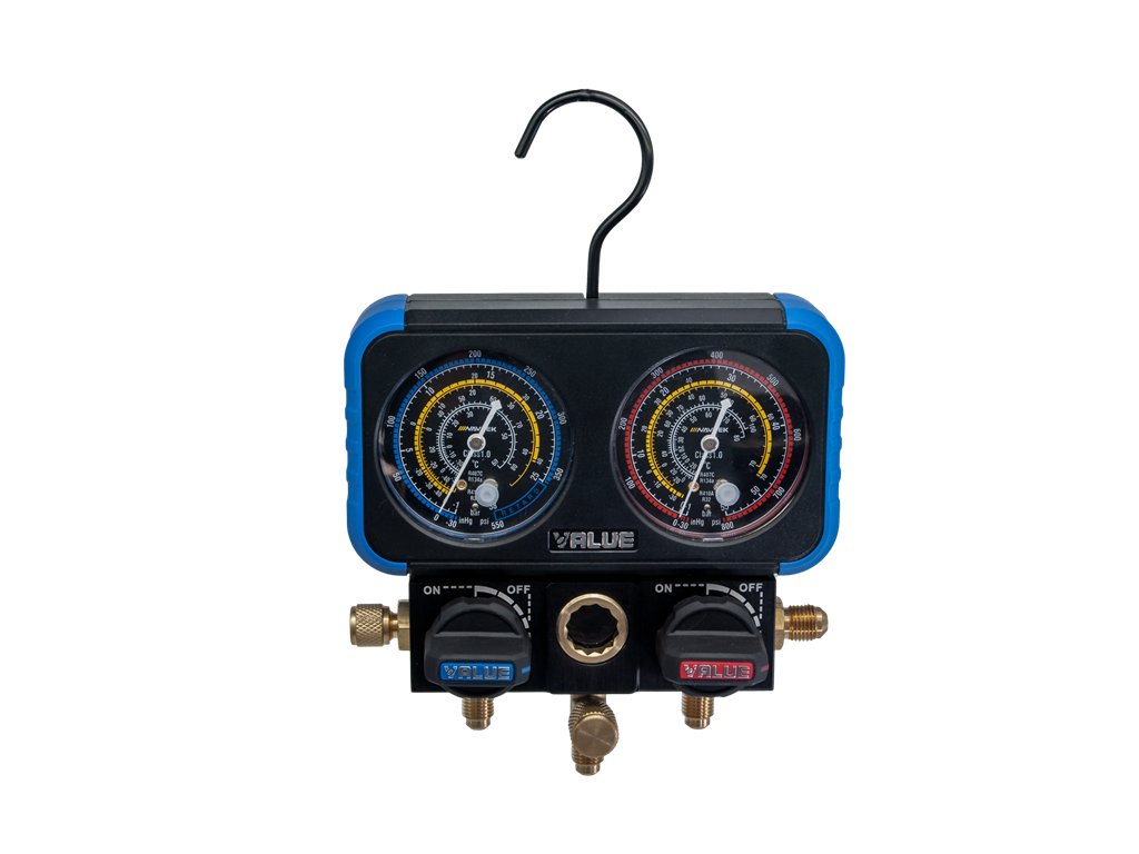 Sada dvojitých analogových tlakoměrů určených pro chladicí a klimatizační systémy.