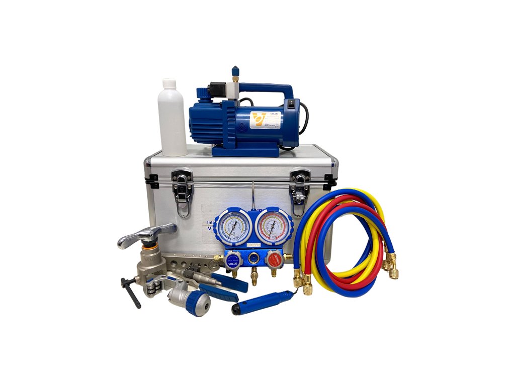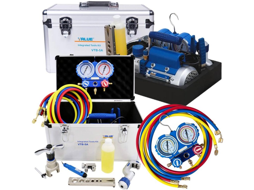 - Vybavení soupravy: vakuová pumpa V-i215S-M , palcový šálek VFT-808-I servisní hadice, řezačka trubek VTC-28B , manometry VMG-2-R410A , bezdůvodné VTT-5 , rozdělovač VST-22 0,33l láhev oleje pro čerpadla, hliníkové pouzdro na přenášení