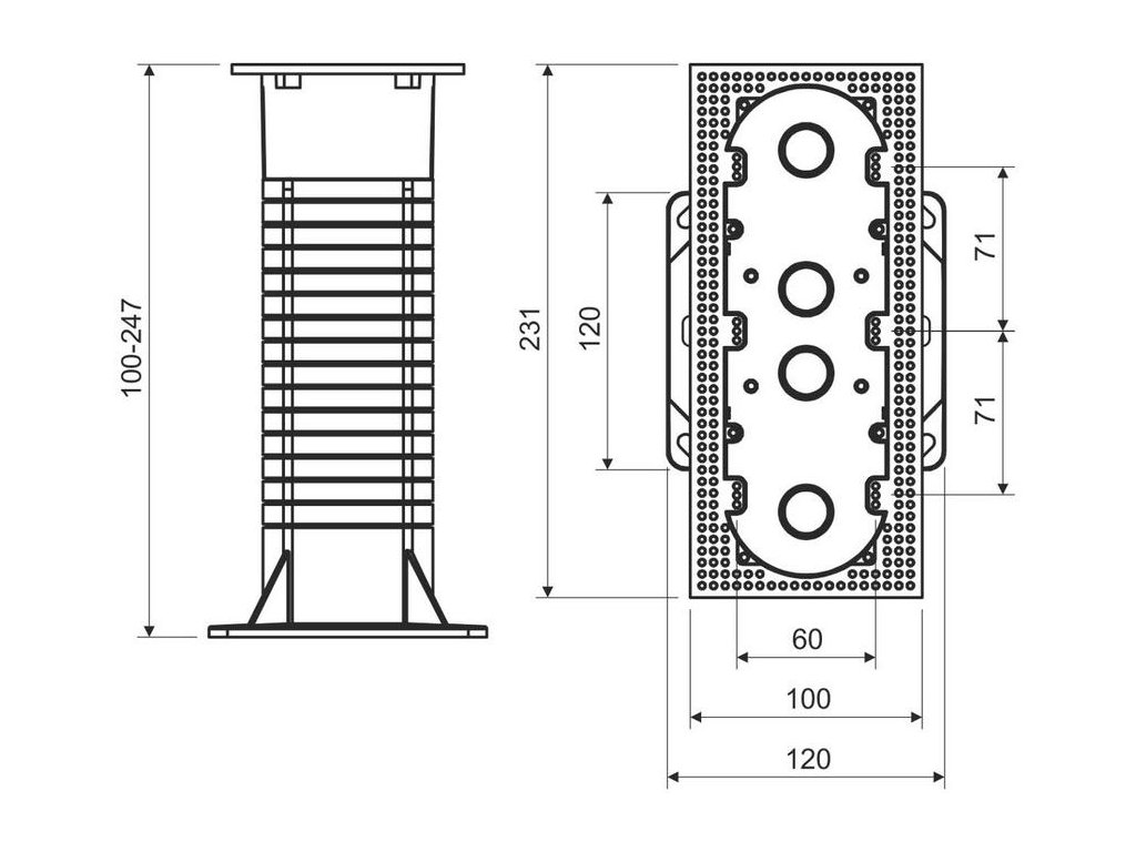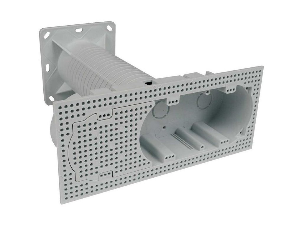 Krabice je určena pro instalaci 2 nebo 3 zařízení do zateplených fasád budov s tloušťkou izolační vrstvy 100-250 mm. Eliminuje vznik tepelných mostů. Součástí balení jsou kvalitní hmoždinky, montážní šrouby a přepážka pro oddělení více okruhů. Při instalaci na silnější omítku se doporučuje utěsnění silikonem.