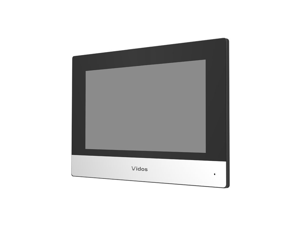 Vnitřní jednotka systému videovrátného VIDOS ONE Monitor umožňuje komunikaci s dveřní stanicí, zobrazení obrazu ze všech IP kamer v systému a správu poplachových čidel integrovaných s videointerkomem.
