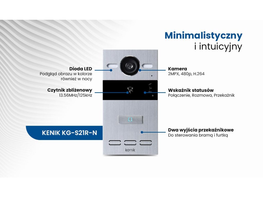 - Robustní konstrukce panelu (vyrobená z hliníku) zaručuje odolnost a spolehlivost. Bezkontaktní čtečka poskytuje dveřní stanici následující informace KENIK další úroveň zabezpečení. Kamera s rozlišením 2MPx a široký pozorovací úhel 110° umožňuje jasný výhled na okolí i za zhoršených světelných podmínek díky funkci funkce nočního světla LED .
