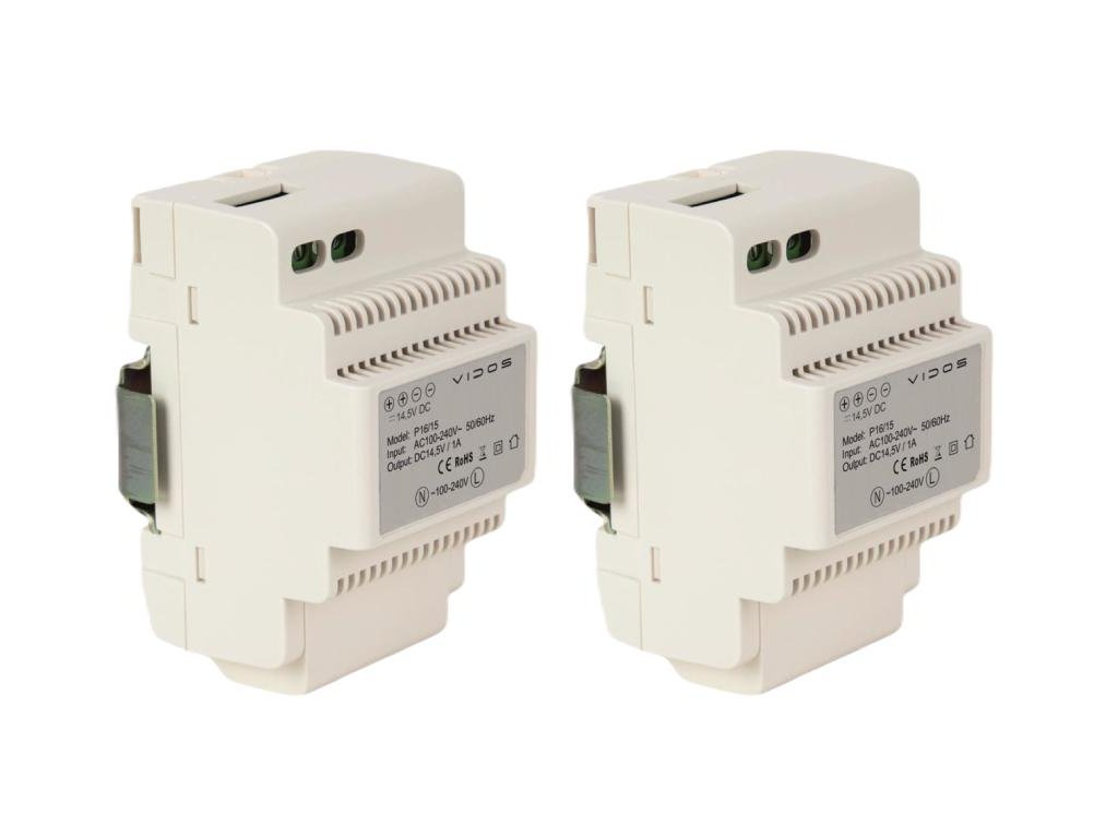 Součástí balení je napájecí zdroj na lištu DIN - 14,5 V DC/1 A - pro napájení monitoru, dveřní stanice a slaboproudého otvírače dveří.