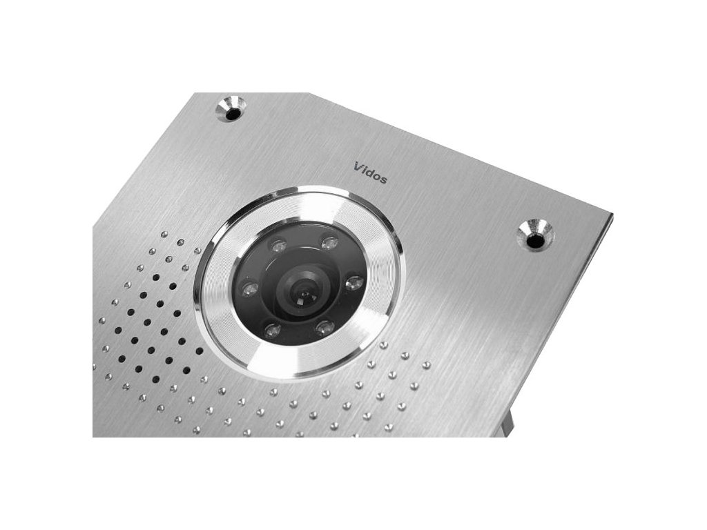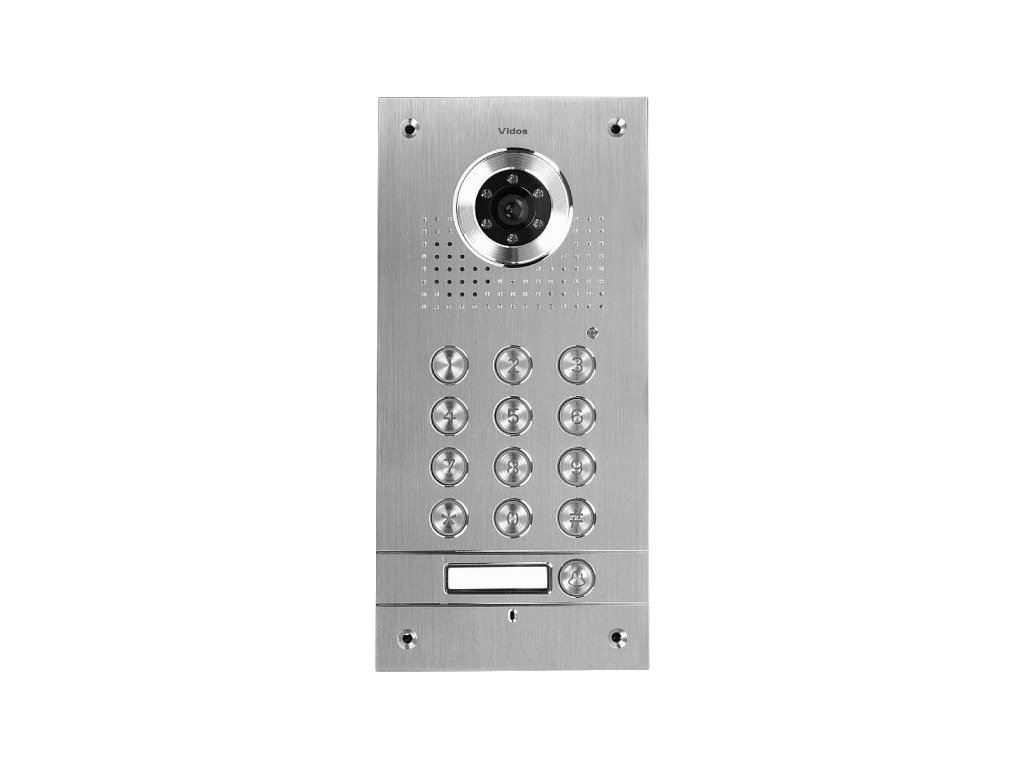 Venkovní panel s jedním účastníkem a kamerou značky VIDOS, určený pro kontrolu vstupu na pozemek, do domu nebo kanceláře, kompatibilní s monitory a dalšími dveřními panely VIDOS a COMPETITION.