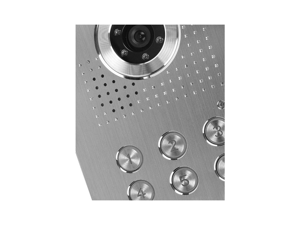 - Dveřní stanice je vybavena barevnou kamerou s možností horizontálního a vertikálního nastavení v rozsahu několika desítek stupňů. Kamera je osvětlena 6 infračervenými diodami LED, které zajišťují pohodlné používání za zhoršené viditelnosti.