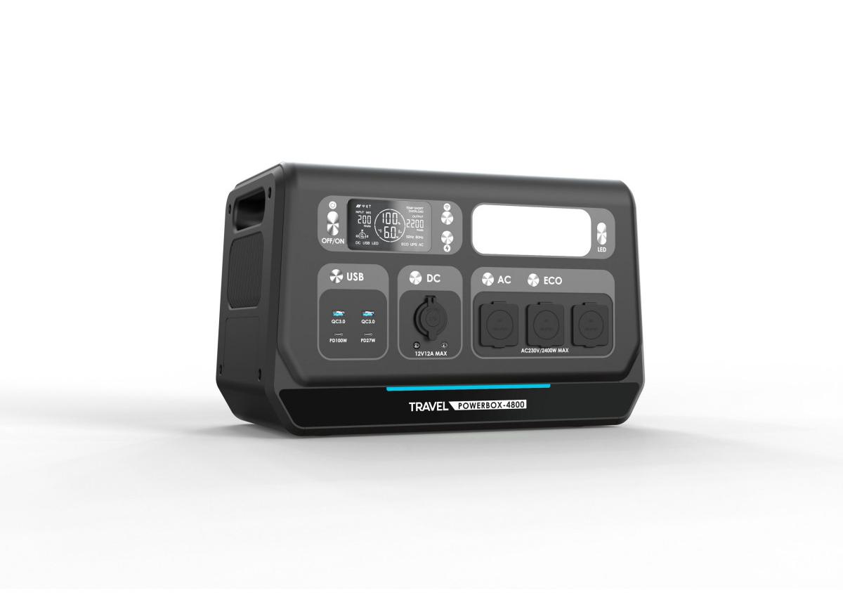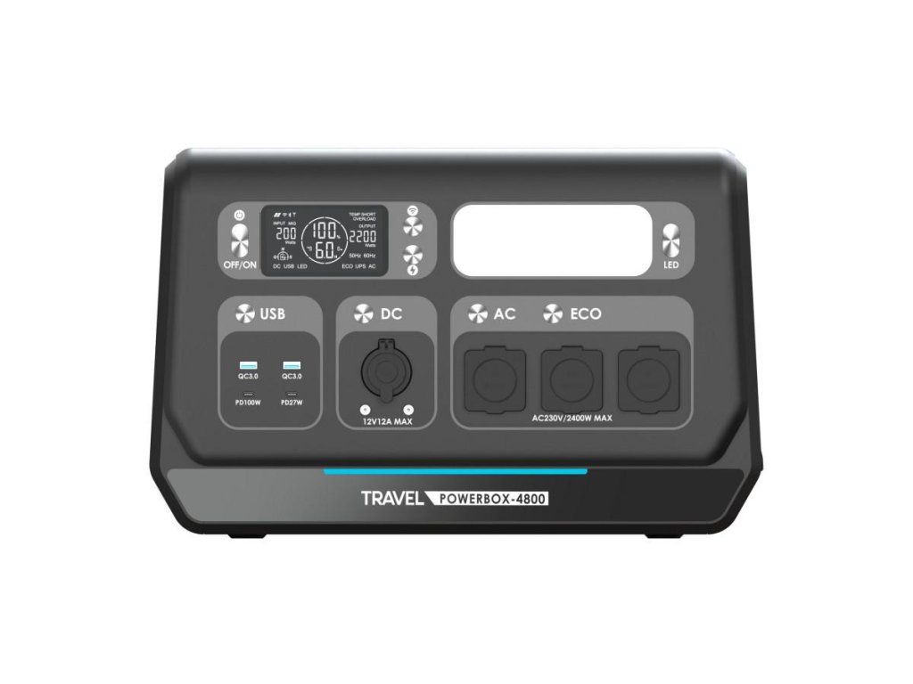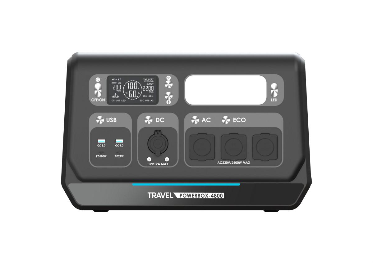 Přenosná elektrocentrála TRAVEL POWERBOX 4800 (2400W) je nejmodernější zařízení, které umožňuje současné napájení několika spotřebičů, například bílé techniky, spotřební elektroniky nebo lékařských přístrojů. Je vybaven výkonnou baterií LiFePO₄ s kapacitou 2048Wh. Zařízení lze nabíjet pomocí solárního panelu, autonabíječky a ze sítě. Hodí se do interiéru i exteriéru, ať už na cestách, při kempování nebo na jachtě. Díky možnosti nabíjení ze solárního panelu je stanice bezpečná a šetrná k životnímu prostředí. Pracuje tiše a nevytváří vibrace ani nepříjemný hluk. TRAVEL POWERBOX 4800 (2400W) lze také použít jako spolehlivý zdroj nouzového napájení při výpadku proudu.
