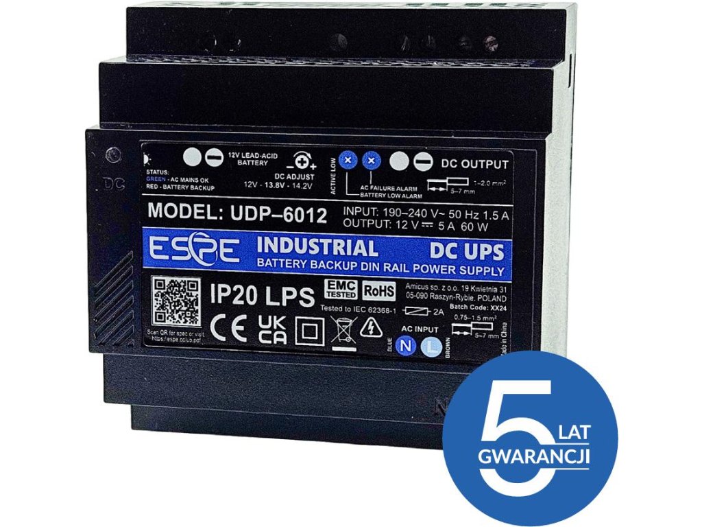 UDP-6012 je 60wattový napájecí zdroj na lištu DIN s možností připojení baterie pro zachování napájení při výpadku sítě. Za běžného provozu zdroj nabíjí připojenou baterii a v případě výpadku síťového napětí využívá energii v ní uloženou k napájení zátěže. Externě připojená baterie umožňuje volbu doby zálohování a poskytuje větší pohodlí. Výstupy napěťového alarmu (výpadek sítě, vybitá baterie) umožňují indikaci stavu a integraci zdroje napájení s oznamovacím systémem. PSU pracuje s gelovým olověným akumulátorem SLA nebo AGM, ale jako akumulátor je možné použít i 4S LiFePO4 pack.